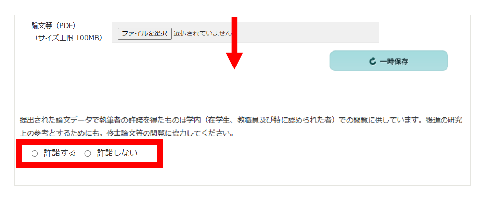 4.提出された論文データで執筆者の許諾を得たものは学内(在学生、教職員及び特に認められた者)での閲覧に供しています。後進の研究上の参考とするためにも、修士論文等の閲覧に協力してください。「許諾する」「許諾しない」のいずれかを選択してください。